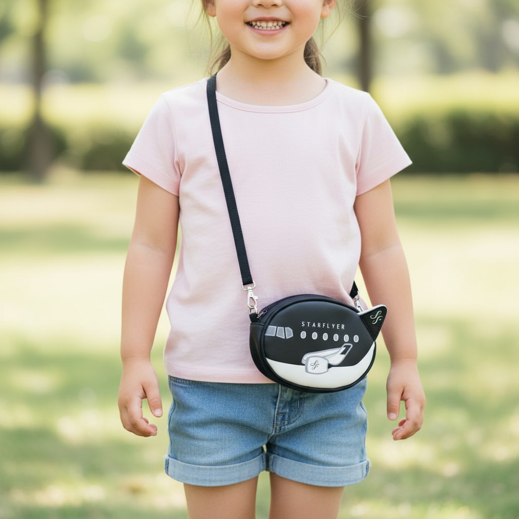 飛行機デザインのポーチが登場!全国の空港で大活躍の『スターフライヤー』の飛行機がかわいらしくクールな斜め掛けポーチになりました!マチは3.5cmでお子様の小物が十分入ります。紐は長さの調節ができるので、小さなお子様から小学生になる頃まで長く使っていただけます。