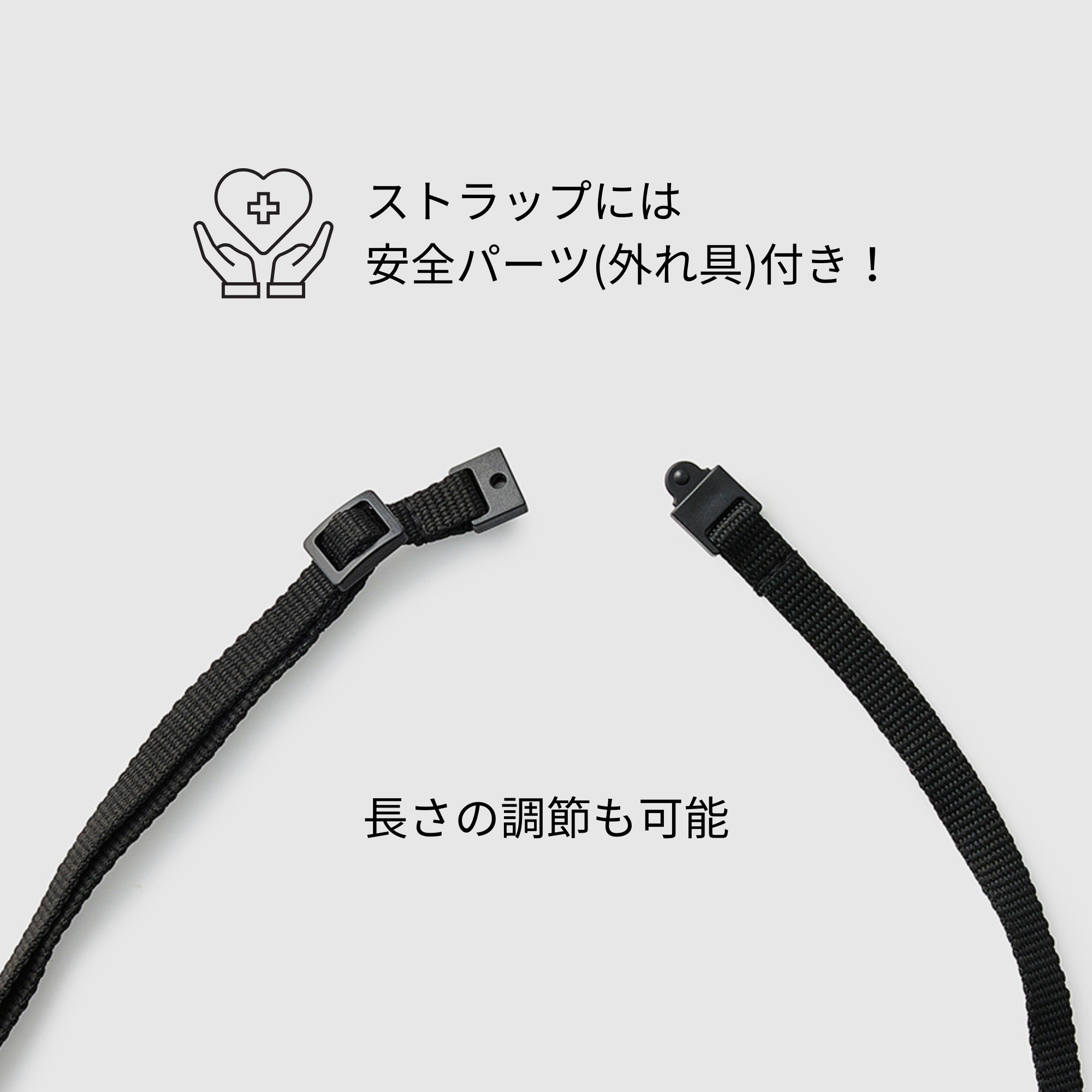 ストラップには安全パーツ(外れ具)がついていて、強い力で引くと外れて万が一の事故を防ぎます。またポーチの金具はナスカンで、ストラップの取り外しができます。