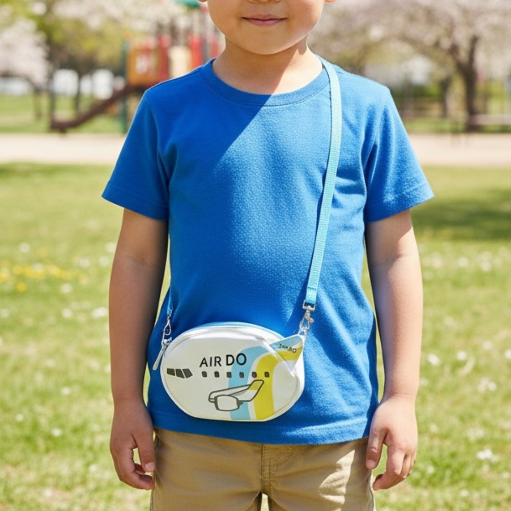 飛行機デザインのポーチが登場!全国の空港で大活躍の『AIRDO』の飛行機がかわいらしくクールな斜め掛けポーチになりました!マチは3.5cmでお子様の小物が十分入ります。紐は長さの調節ができるので、小さなお子様から小学生になる頃まで長く使っていただけます。