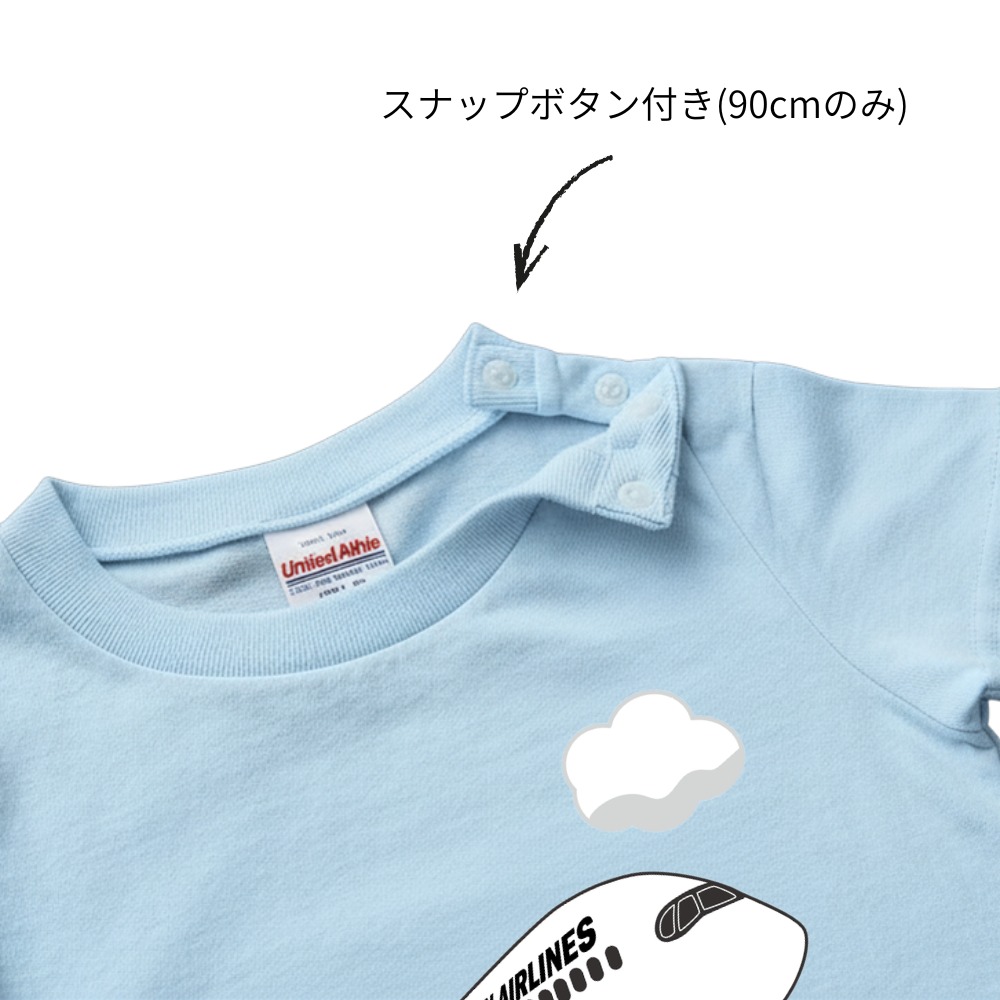空を飛ぶJALの飛行機が大きく描かれた、元気いっぱいのキッズTシャツです。シンプルなレッド・ライトブルーの生地にJALの機体が映え、飛行機好きのお子さまにぴったり。柔らかなコットン素材で肌ざわりも快適です。サイズは90・100・110cmの3種類をご用意。90cmサイズには、お子さまが着替えやすいよう肩にスナップボタン付き。サイズは90・100・110cmの3種類をご用意。普段着にもお出かけにもおすすめの1枚です。