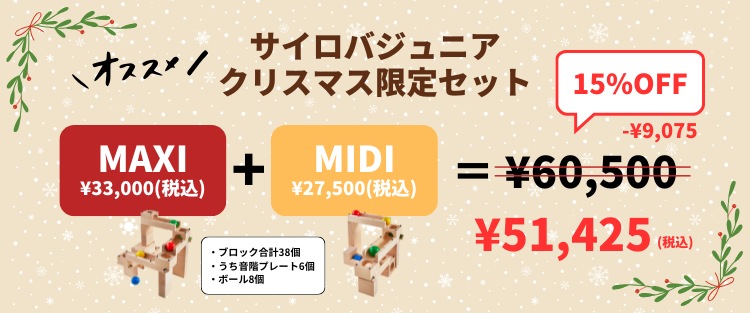 【通常価格より15%OFF】サイロバジュニアのMAXIとMIDIを合わせた、クリスマス特別拡張セットです。 ブロック合計38個、うち音階プレート付きブロックは6個、ボールは合計8個。 長く楽しんでいただくためのノベルティ「お手入れオイルセット」付き、特別なクリスマスセットです。