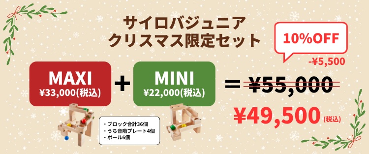 【通常価格より10%OFF】サイロバジュニアのMAXIとMINIを合わせた、クリスマス特別拡張セットです。 ブロック合計36個、うち音階プレート付きブロックは4個、ボールは合計6個。 長く楽しんでいただくためのノベルティ「お手入れオイルセット」付き、特別なクリスマスセットです。