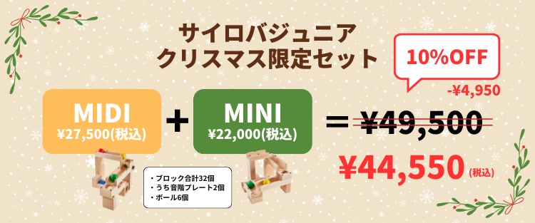 【通常価格より10%OFF】サイロバジュニアのMIDIとMINIを合わせた、クリスマス特別拡張セットです。 ブロック合計32個、うち音階プレート付きブロックは2個、ボールは合計6個。 長く楽しんでいただくためのノベルティ「お手入れオイルセット」付き、特別なクリスマスセットです。